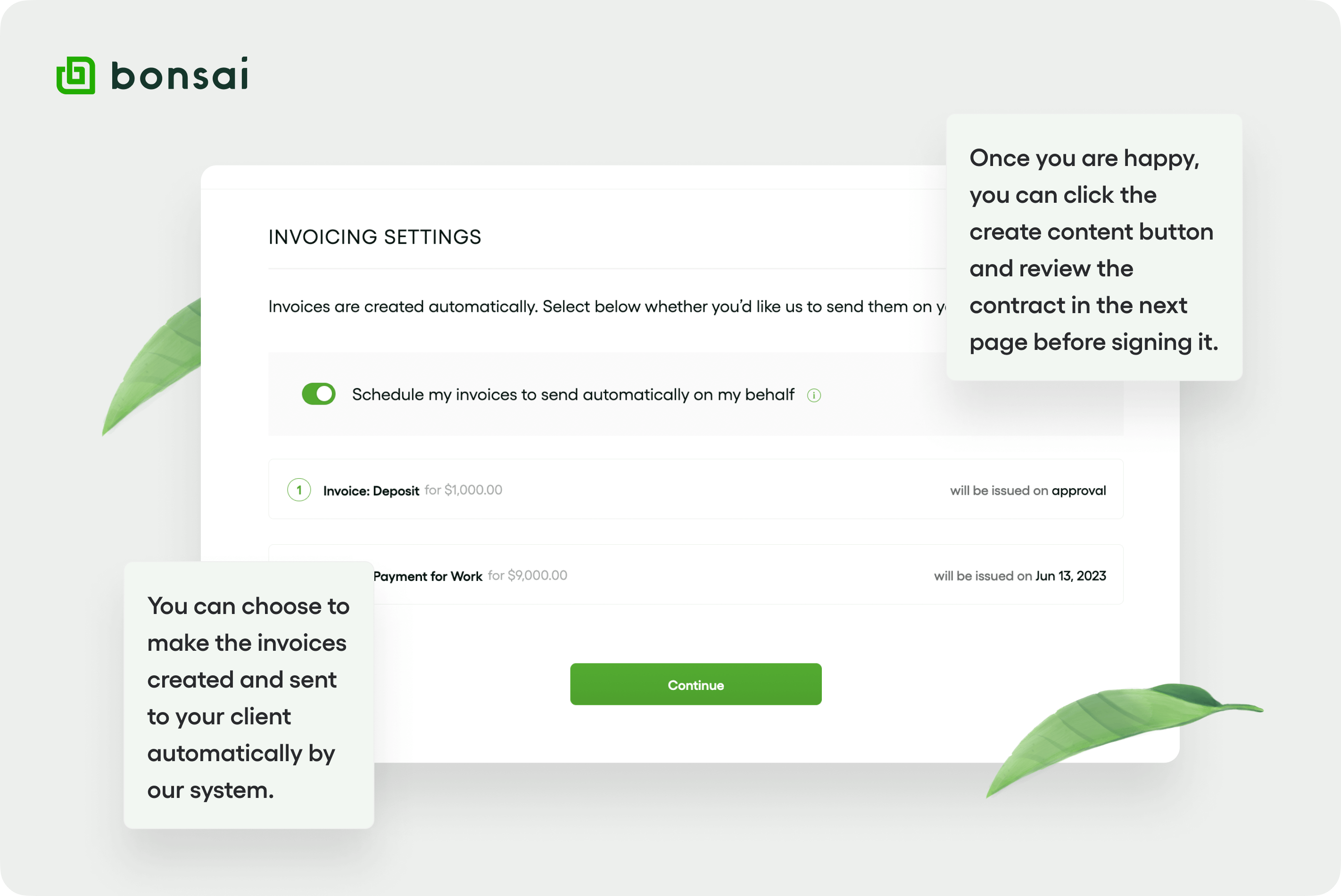 - Prêt à commencer ? Il vous suffit de vous inscrire sur Bonsai, de télécharger, de modifier et d'envoyer votre contrat pour qu'il soit signé électroniquement par votre client.