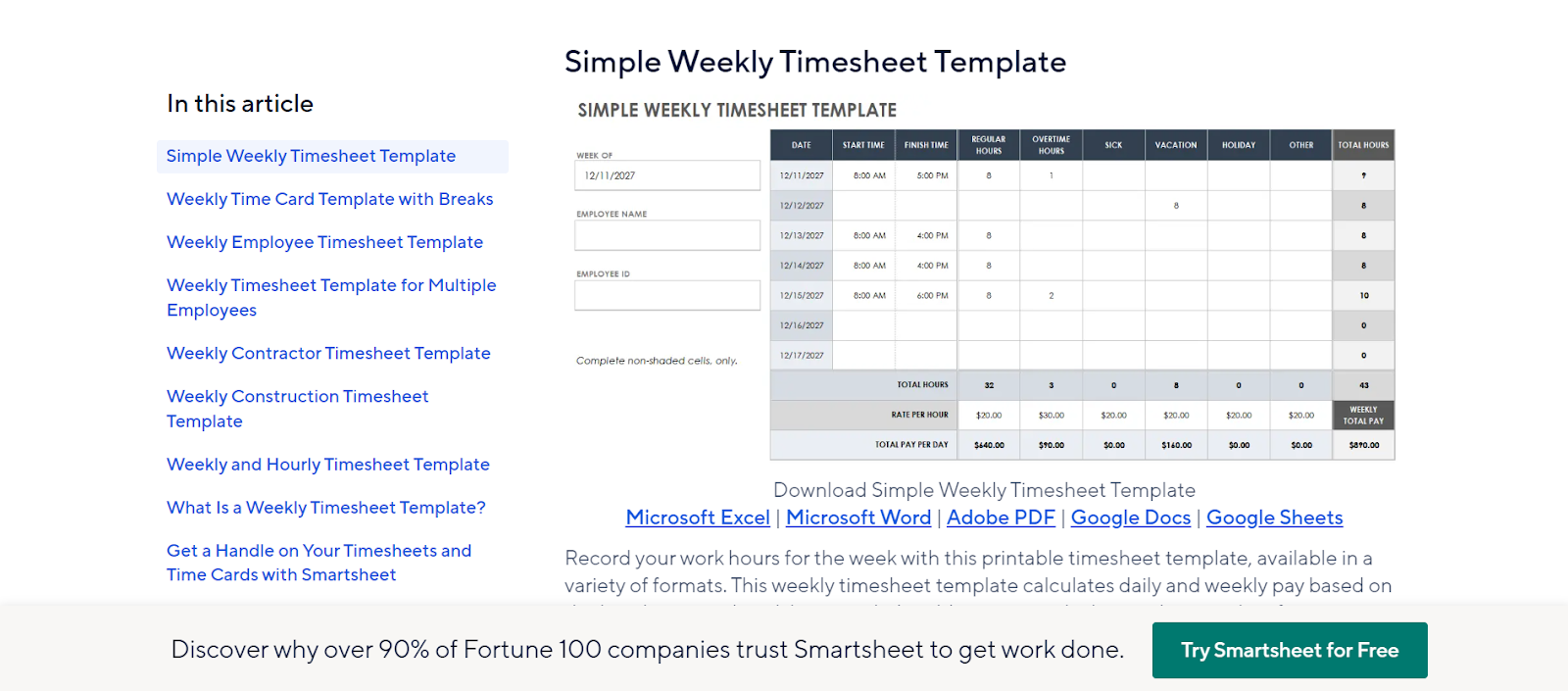 Smartsheet propose toute une gamme de modèles de feuilles de temps gratuits qui répondent à différents besoins, tels que des modèles de feuilles de temps quotidiennes, hebdomadaires, bihebdomadaires et mensuelles. Ces modèles peuvent vous aider à suivre les heures de travail, à gérer la paie et à garantir une facturation précise. Ils sont disponibles dans un format imprimable, ce qui les rend incroyablement conviviaux et efficaces.