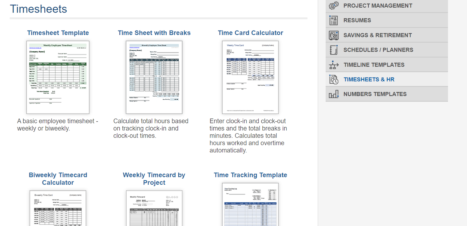 La collection comprend des modèles de feuilles de temps quotidiennes, hebdomadaires, bihebdomadaires et mensuelles.