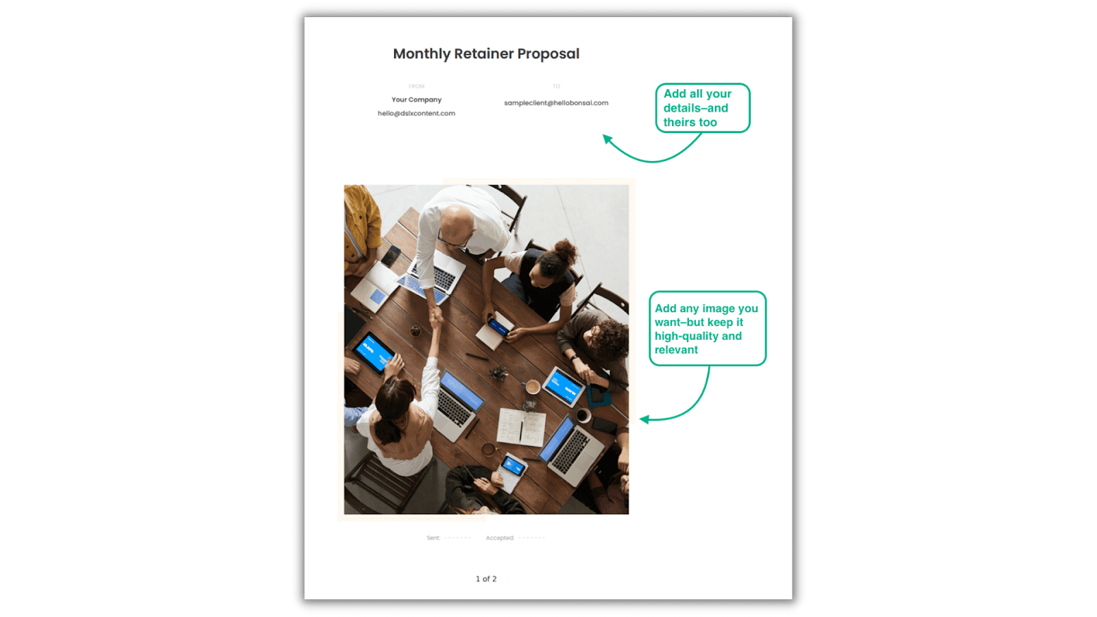 Adaptez votre proposition aux souhaits de votre client — idéalement, cela devrait se faire après une discussion approfondie avec lui. Si vous comprenez leurs besoins, leurs défis et leurs difficultés, vous pouvez vous assurer que votre proposition de forfait mensuel correspond parfaitement à leurs besoins.