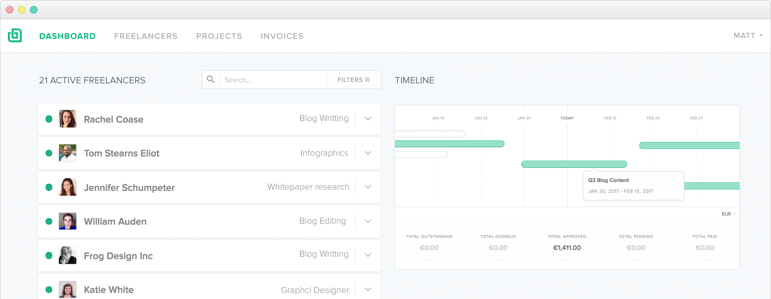 Invite your freelancers to join your talent pool and get access to their private dashboard and work history.